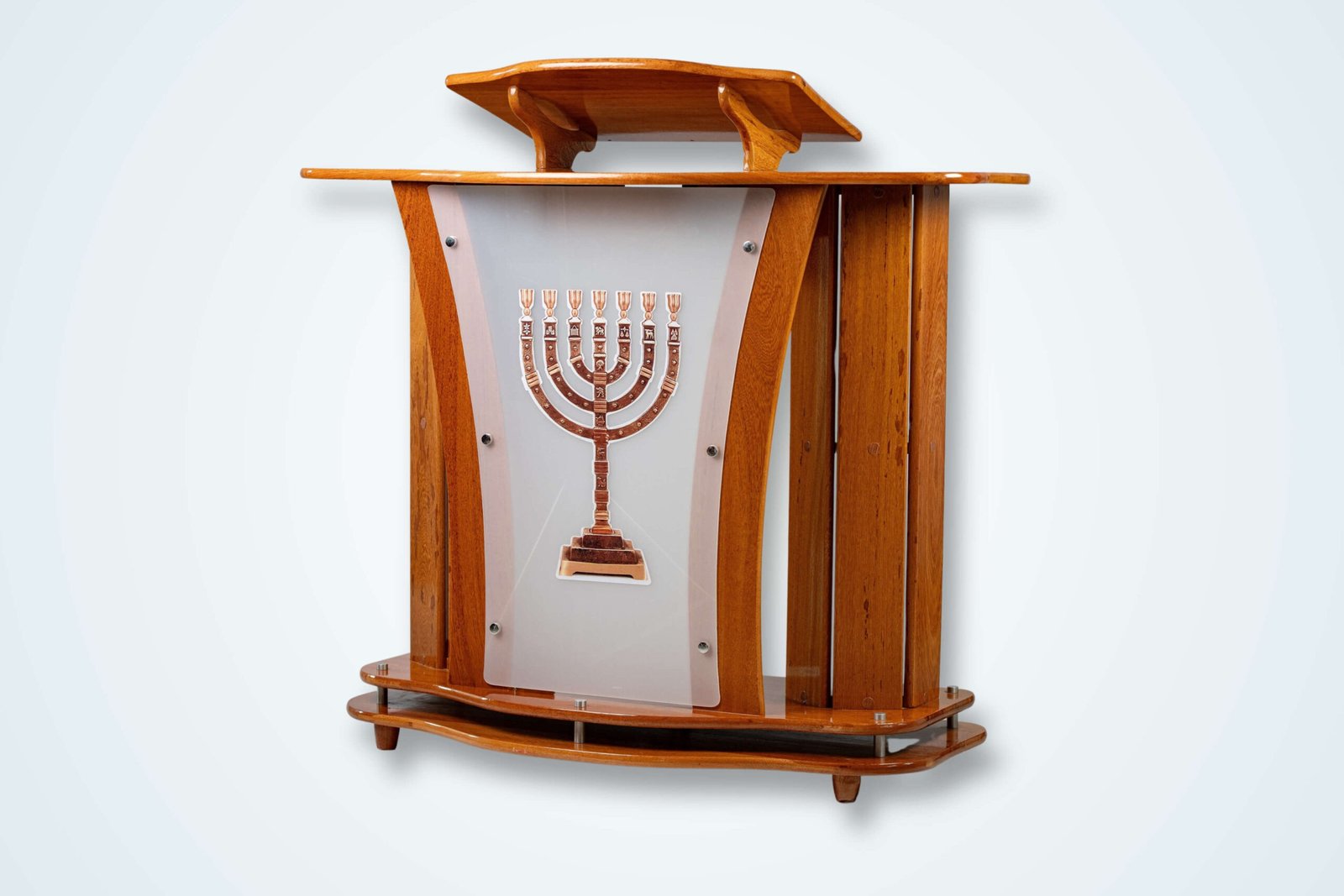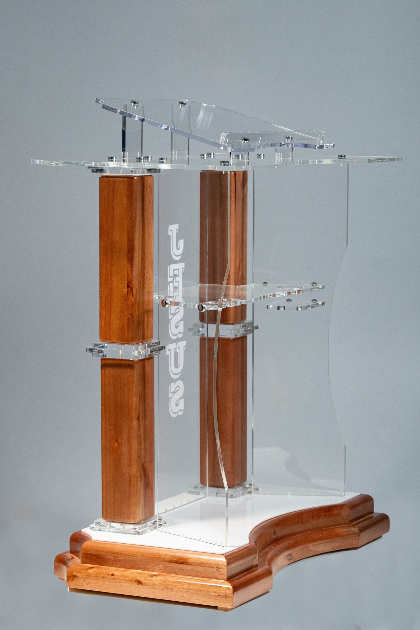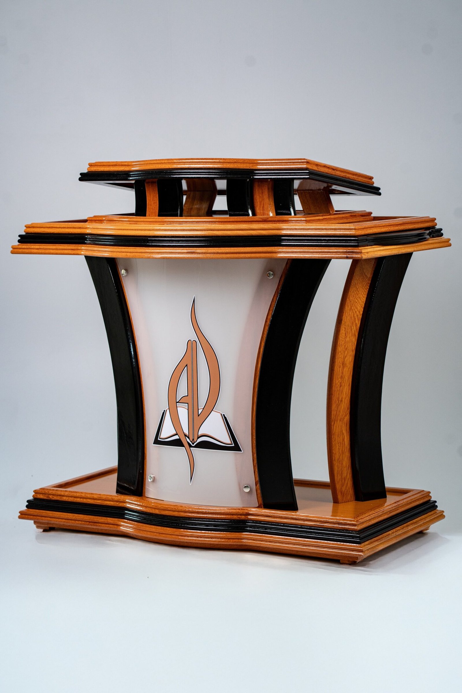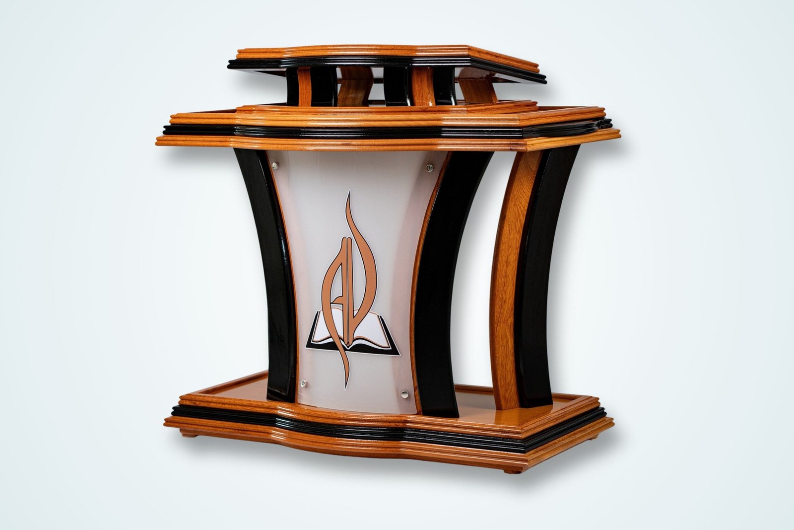 Disponíveis em madeira Angelim, acrílico cristalino ou versões combinadas, nossos púlpitos podem incluir gavetas, porta-microfone, LED e personalização com o nome ou logotipo da igreja.
