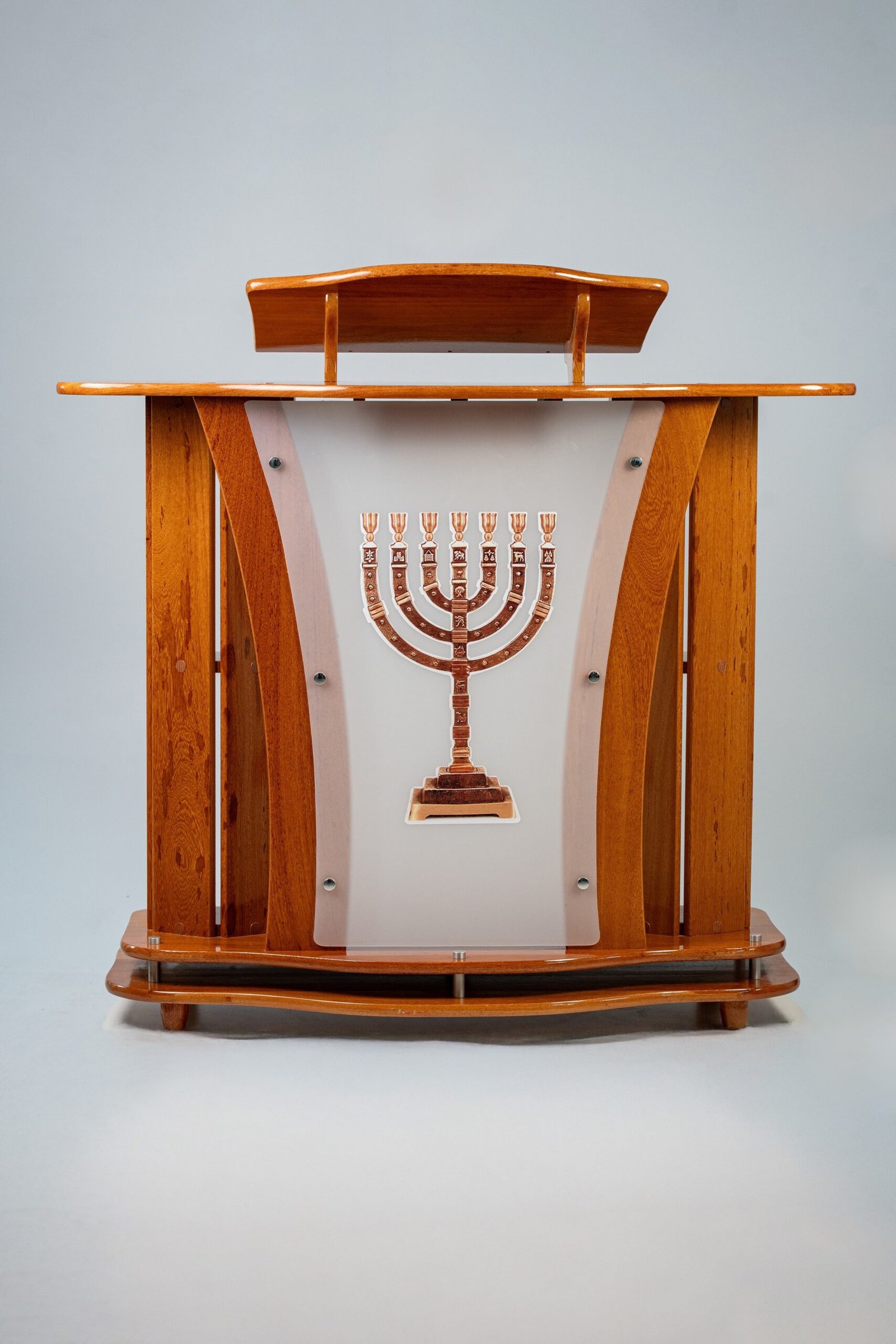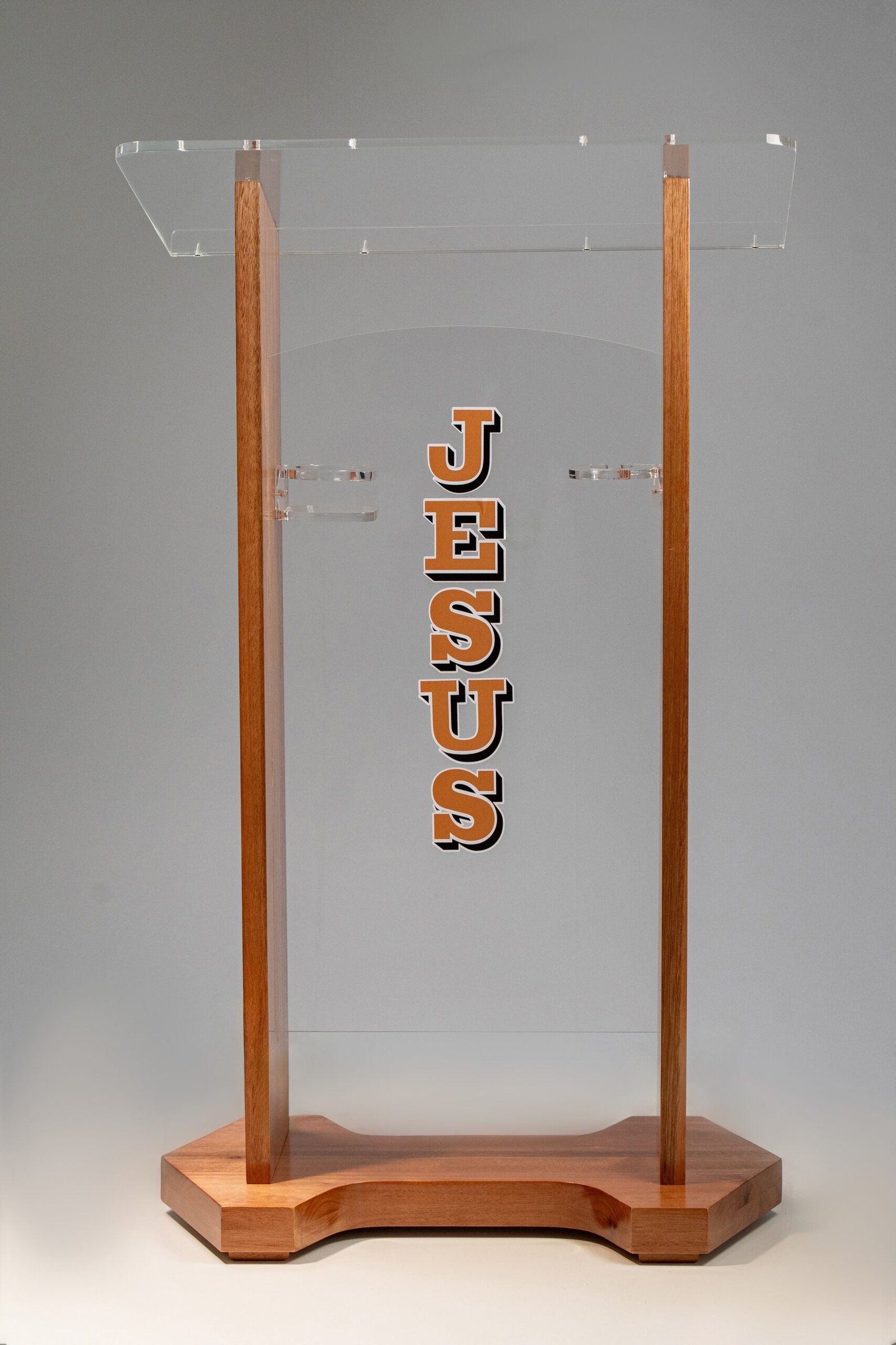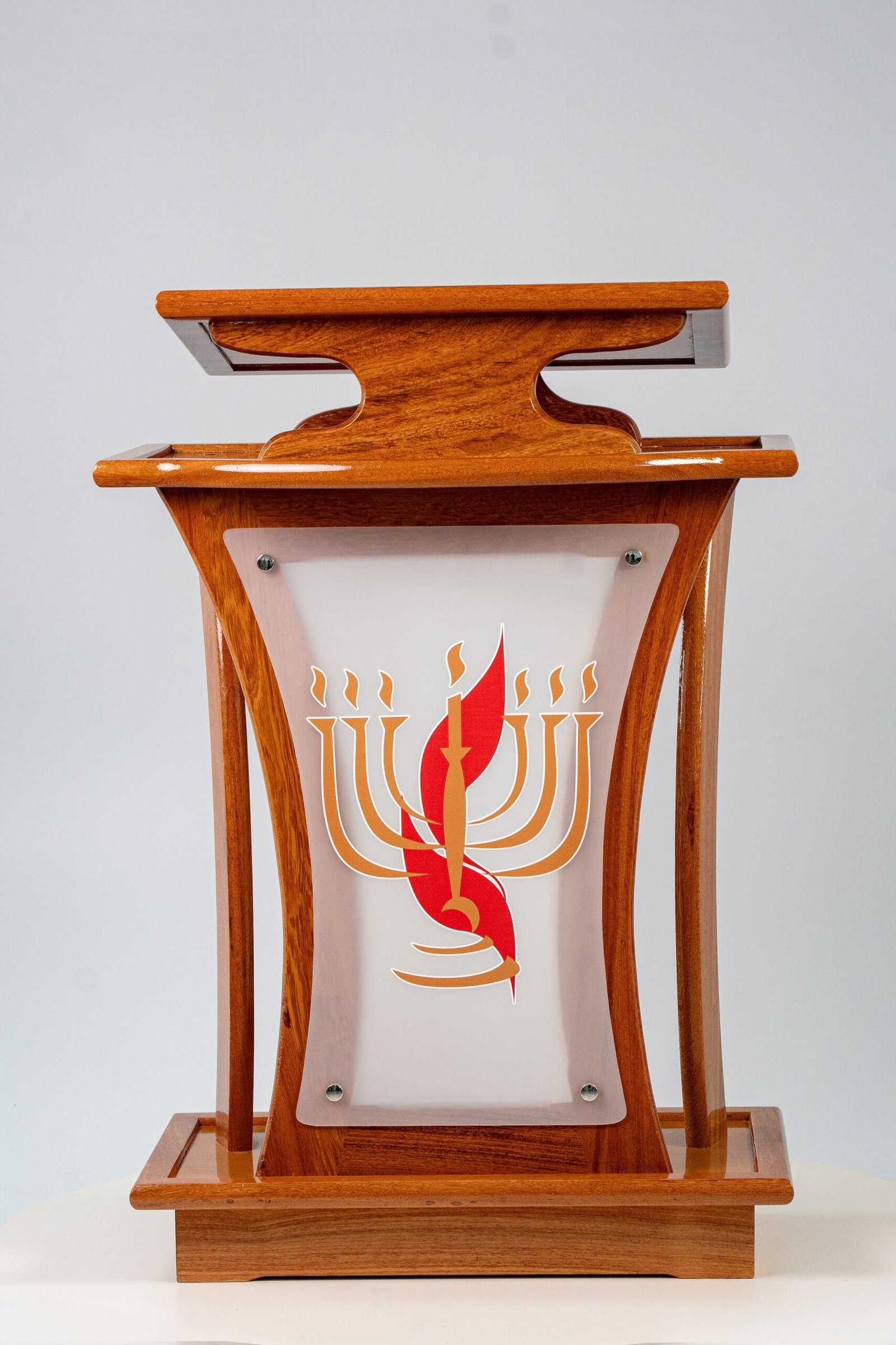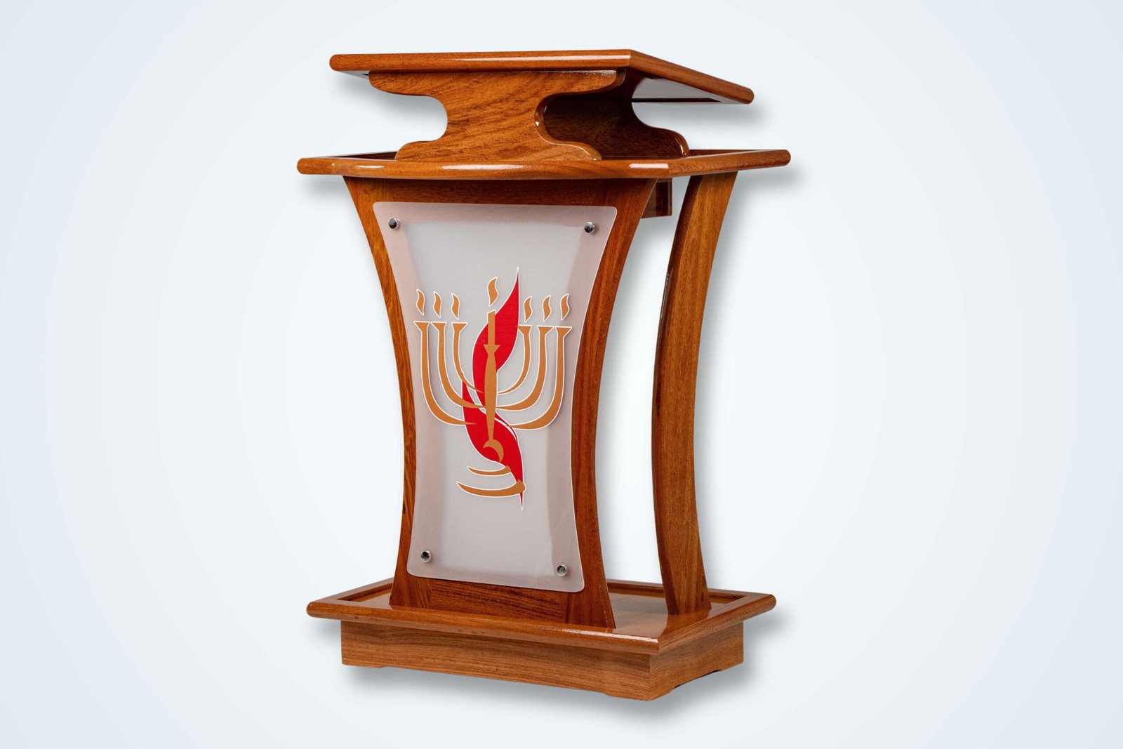 Disponíveis em madeira Angelim, acrílico cristalino ou versões combinadas, nossos púlpitos podem incluir gavetas, porta-microfone, LED e personalização com o nome ou logotipo da igreja.