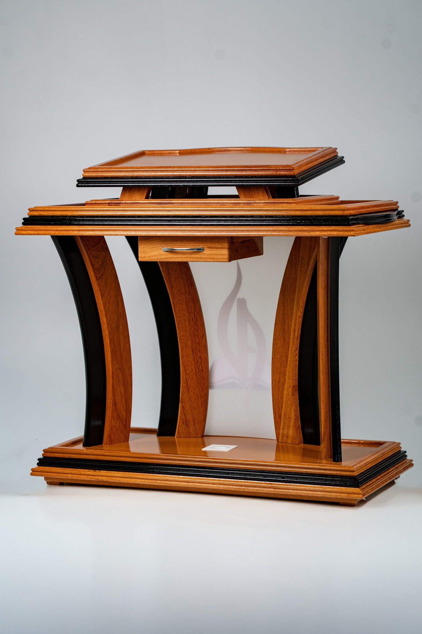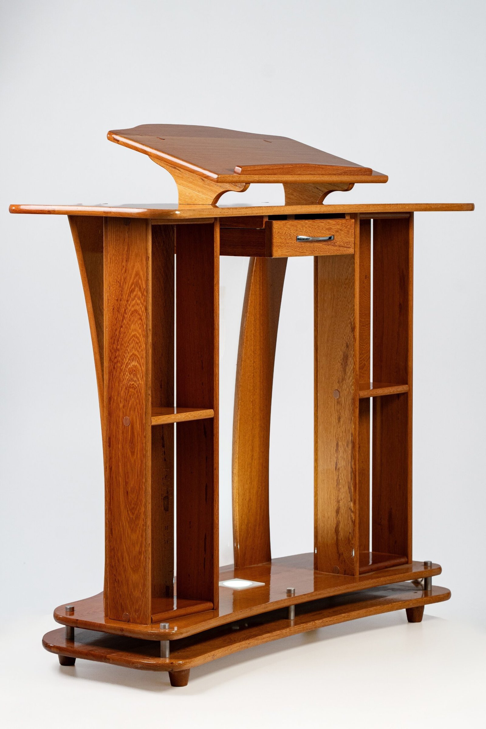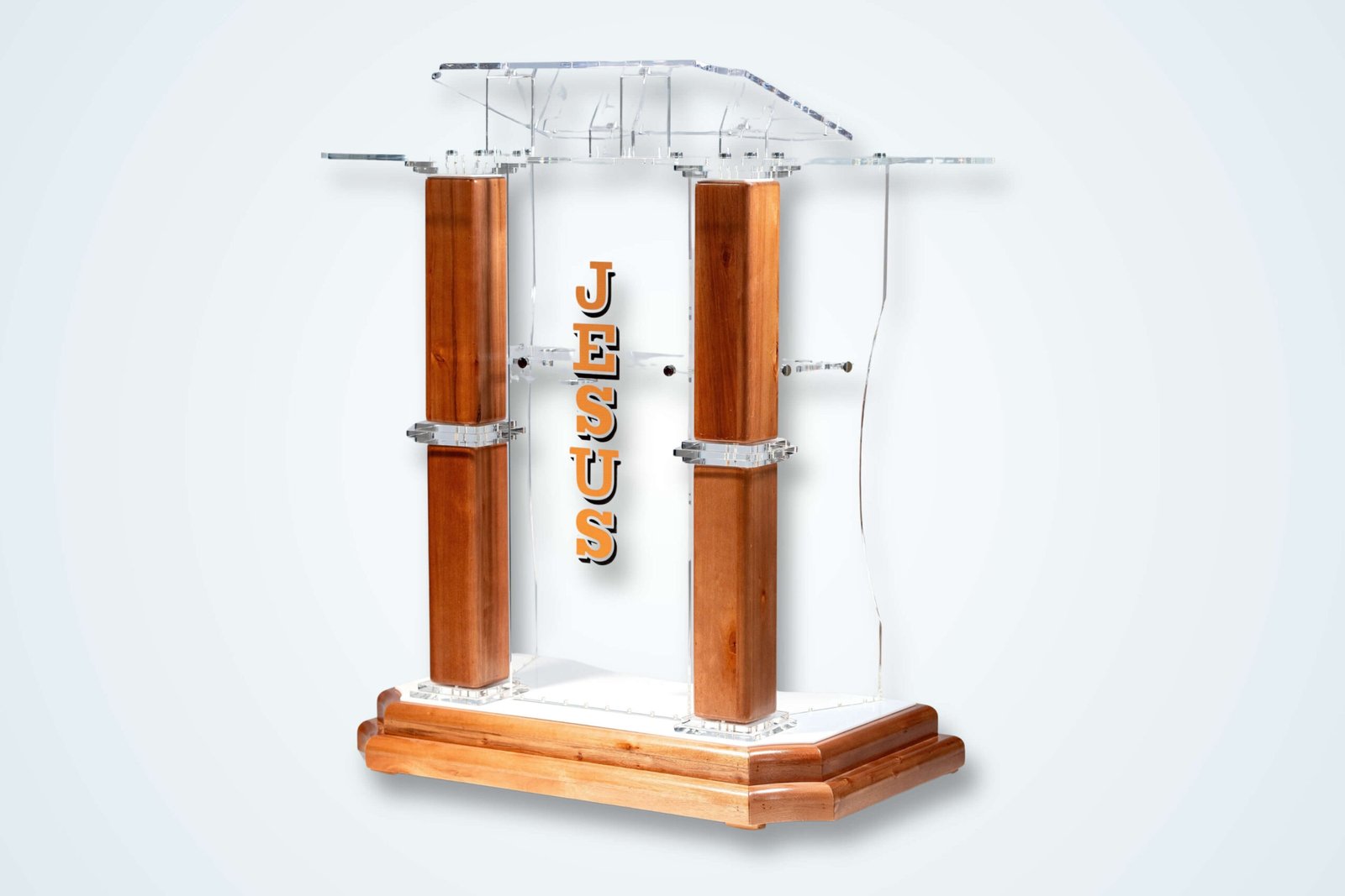 Púlpitos produzidos em madeira nobre e acrílico premium, com design moderno, estabilidade e acabamento impecável.